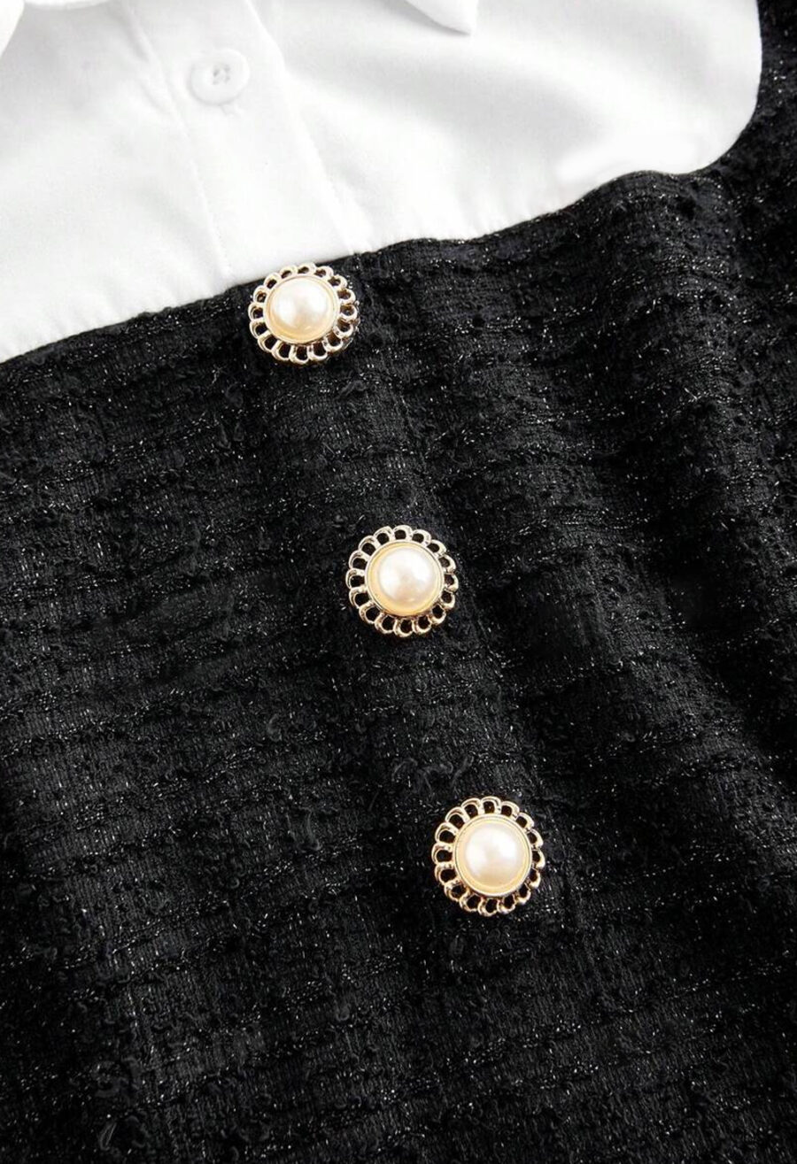 Zekbay A-Line Dress Black & White Tweed With Lantern Sleeves