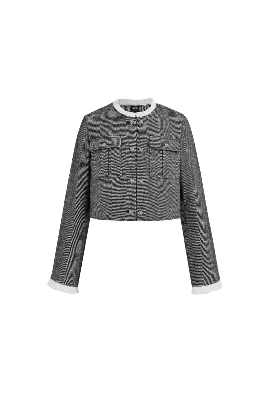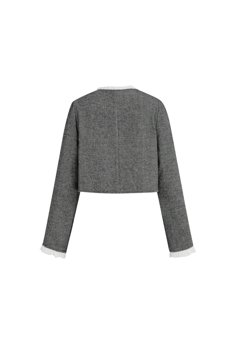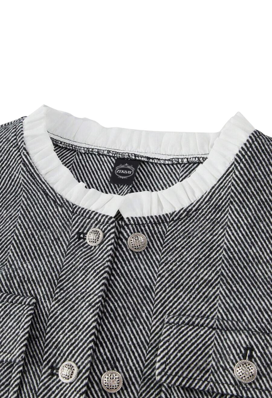 Zekbay Timeless Grey Pleated Round Short Coat Round Neck Long Sleeve