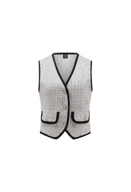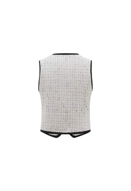 • Design Details: Asymmetrical cut with contrasting bindings. • Neckline: V-neck. • Style: Elegant. • Type: Sleeveless top. • Hem Shape: Asymmetrical hem. • Color: Black and white color block with solid and all-over print. • Fit: Regular fit. • Length: Short length. • Material: 100% polyester. • Fabric Stretch: […]
