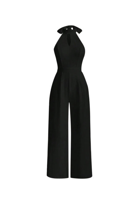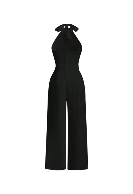• Design Details: Features an open back, tie detail, and integrated zipper closure. • Trim: Halter neck with ties for a secure fit. • Style: Elegant and chic. • Color: Solid black. • Type: Wide-leg jumpsuit. • Waist: High-waisted for a flattering silhouette. • Length: Full length. • Fit: Regular […]