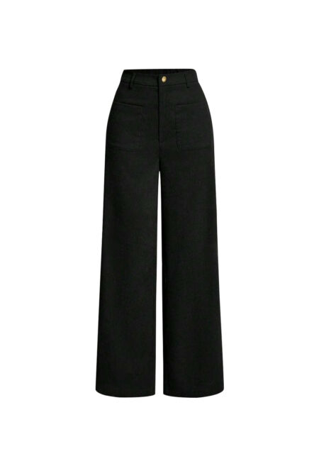 • Closure Type: Integrated zipper closure • Design Details: Buttons, pockets, and zipper • Style: Casual • Color: Solid black • Type: Wide-leg pants • Waist: High-waisted • Length: Super long • Fit: Regular fit • Material: 97% polyester, 3% spandex • Fabric Stretch: Light stretch • Care Instructions: Machine […]