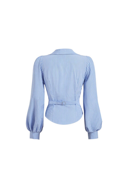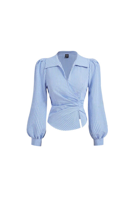 • Design Details: Tie-front design with bundled accents. • Neckline: Round neck. • Sleeve Type: Long lantern sleeves. • Style: Casual. • Type: Top. • Hem Shape: Asymmetrical hem. • Color: Blue with stripes. • Fit: Regular fit. • Length: Regular length. • Material: 100% polyester. • Fabric Stretch: Non-stretch […]